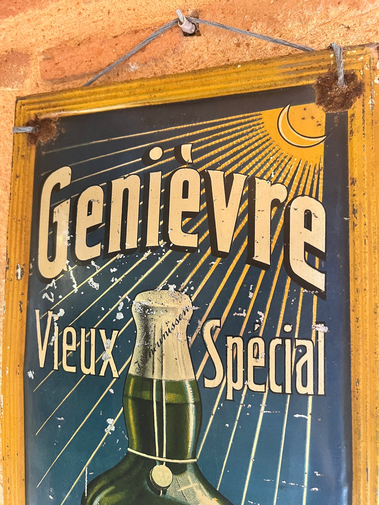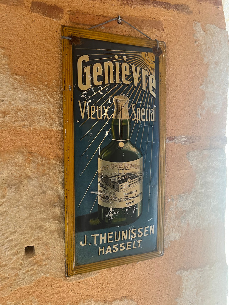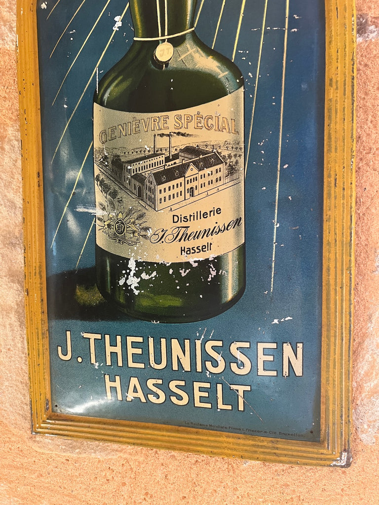 Rare enseigne / plaque publicitaire vintage en métal peint Genièvre J. Theunissen Hasselt - La Réclame Mondiale Bruxelles.