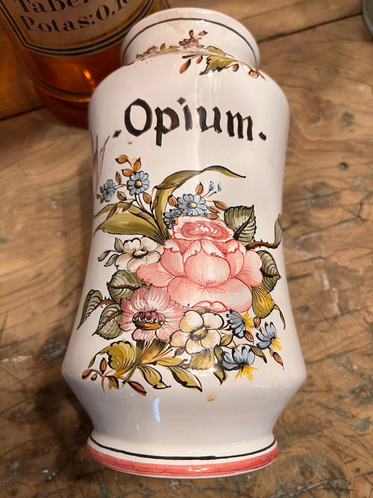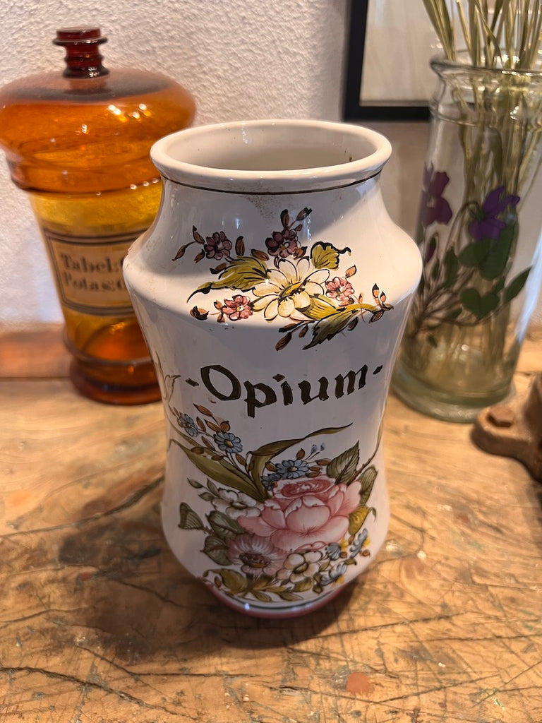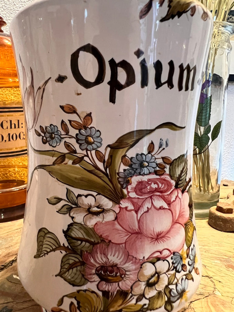 Grand pot de pharmacie / d'apothicaire vintage Opium en faïence Lalliers à Moustiers.
