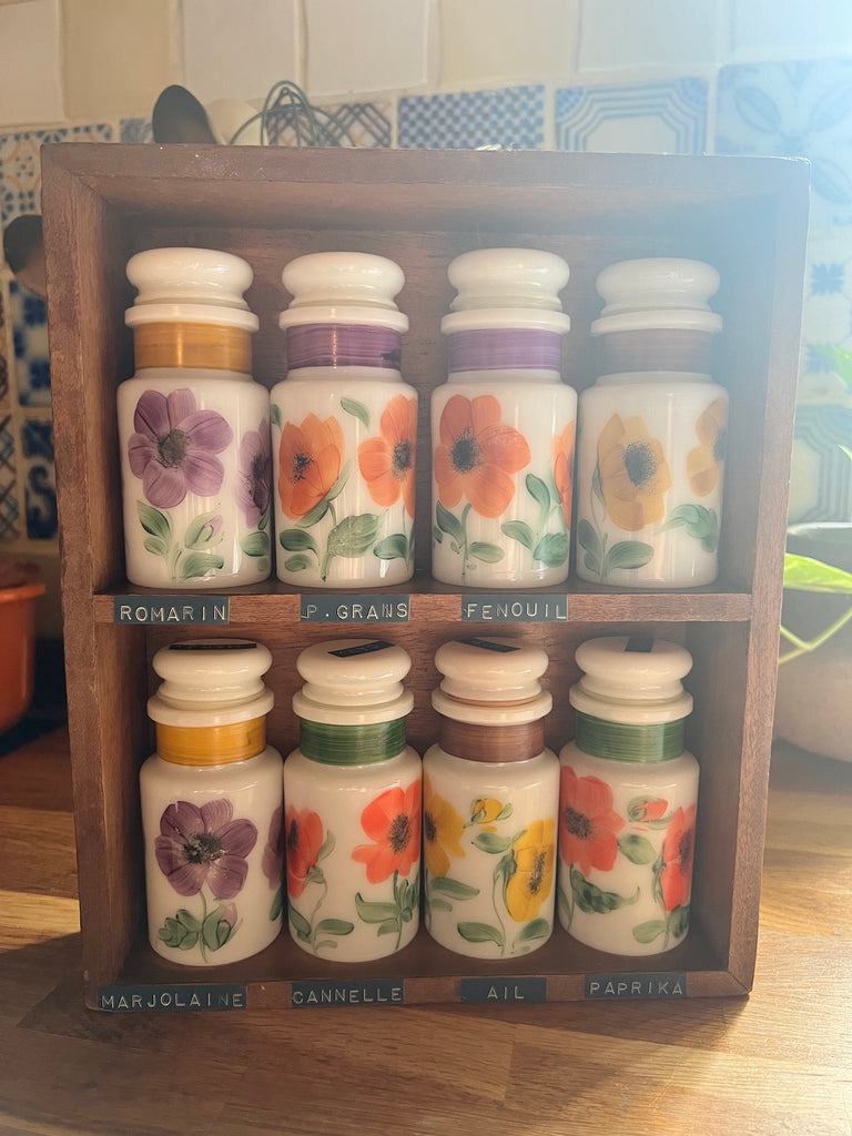 Présentoir à épices vintages en bois avec ses flacons en verre opaline peint à la main.