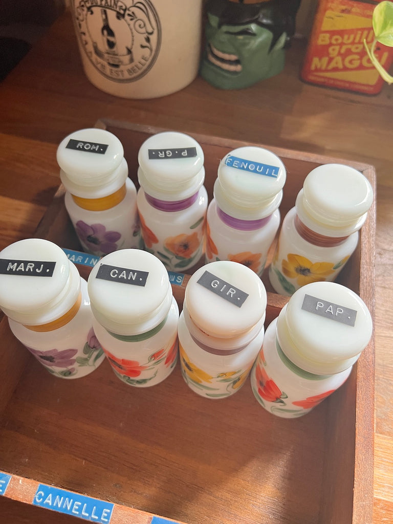 Présentoir à épices vintages en bois avec ses flacons en verre opaline peint à la main