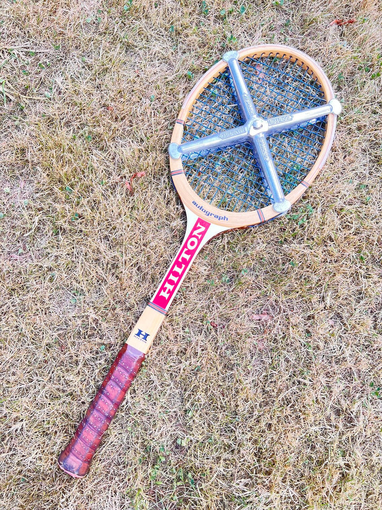 Raquette de tennis vintage en bois Hilton Autograph avec housse et tendeur Zephyr.